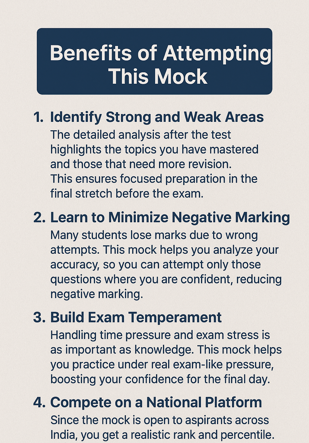 This national-level mock serves as a powerful diagnostic tool to evaluate your current level of preparation, highlight your strengths, reveal hidden weak areas, and give you clear direction on where to focus your final revision efforts. It also provides an opportunity to compare your performance with thousands of serious candidates across India, giving you a realistic picture of where you stand in the competition.