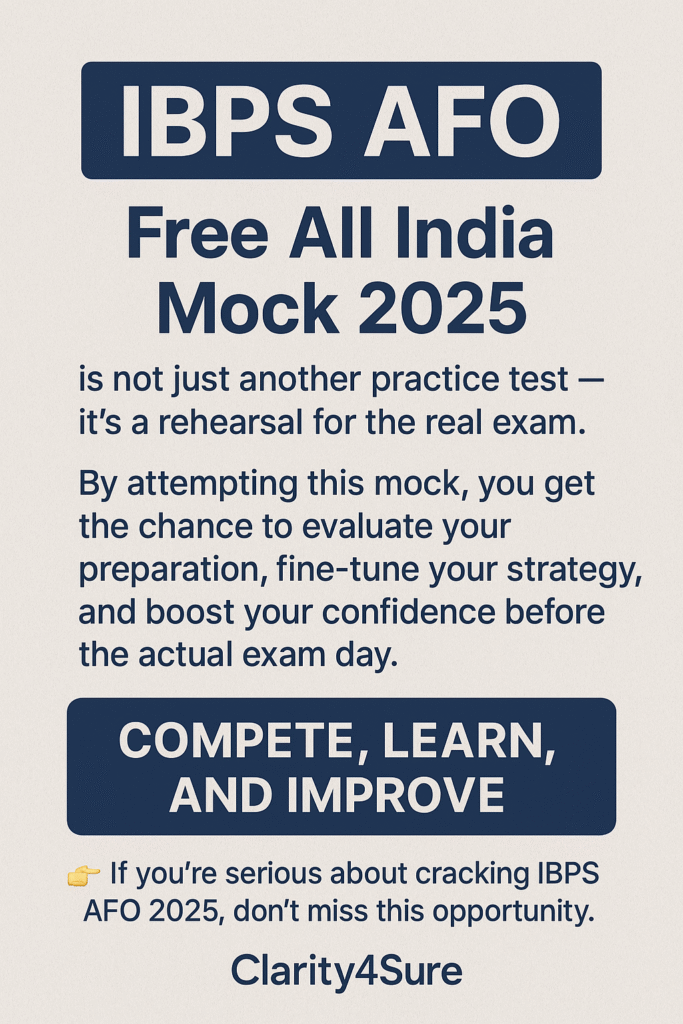 “Ready to experience the closest simulation to the actual IBPS AFO battle?” “Clarity4Sure presents the IBPS AFO Free All India Mock 2025 — your ultimate chance to evaluate your preparation before the real exam.”